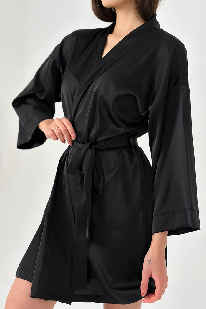 Our silk robe, crafted from the finest Armani faux silk, is designed for those who appreciate luxury even in the smallest details. Its light, almost weightless fabric gently caresses the skin, offering a sense of complete relaxation. The roomy cut allows for free movement, while the belt accentuates your natural curves, adding grace and allure to your look.